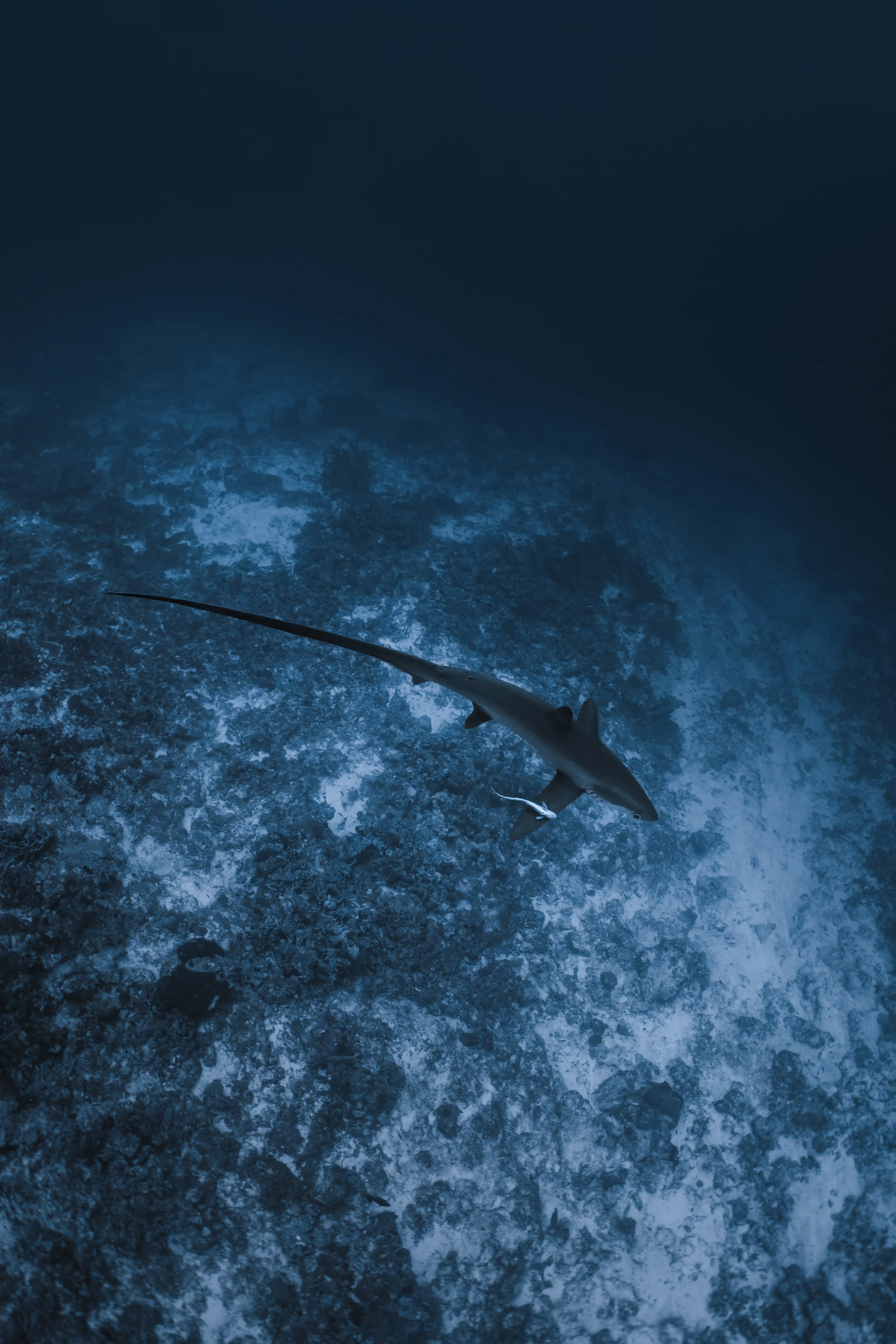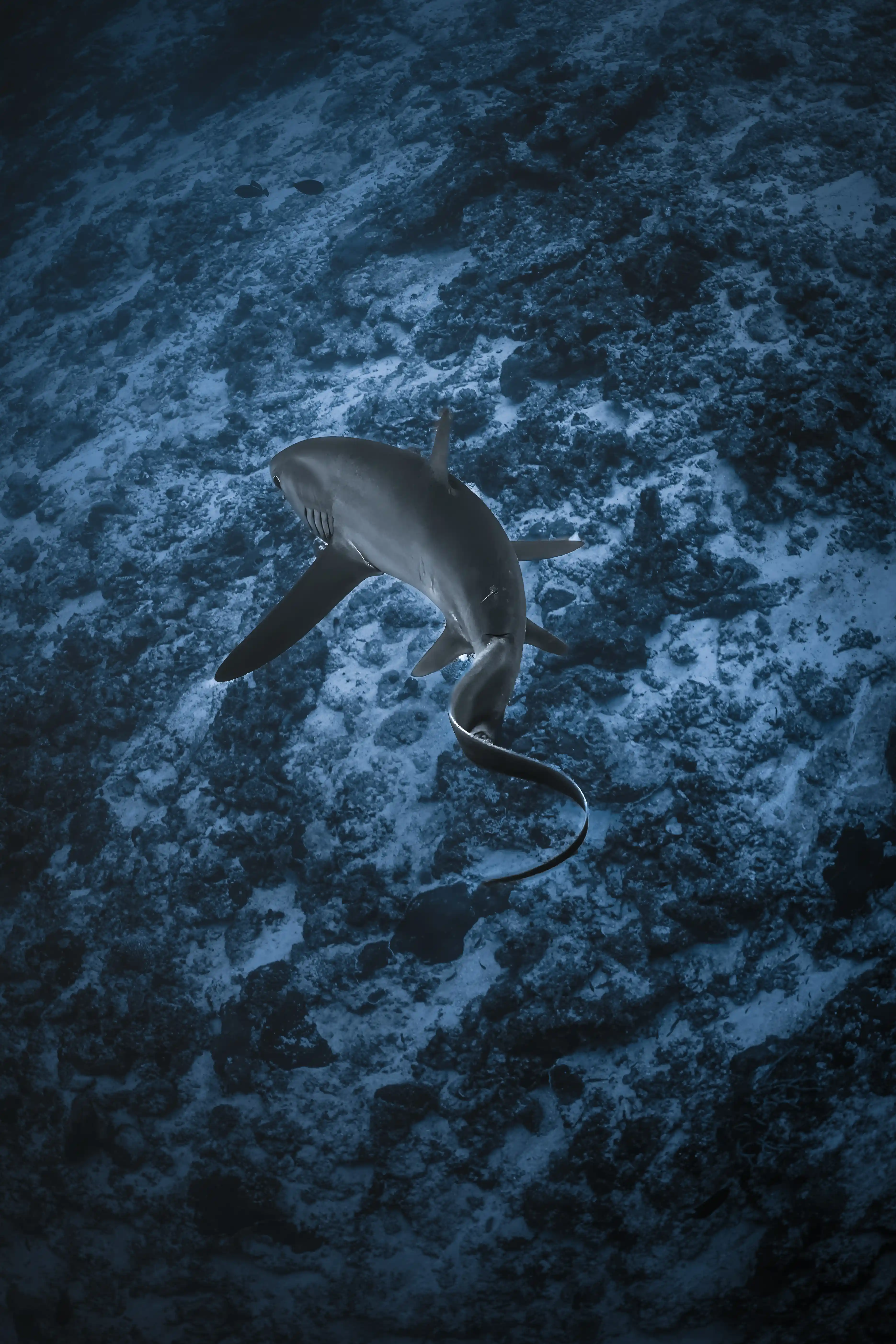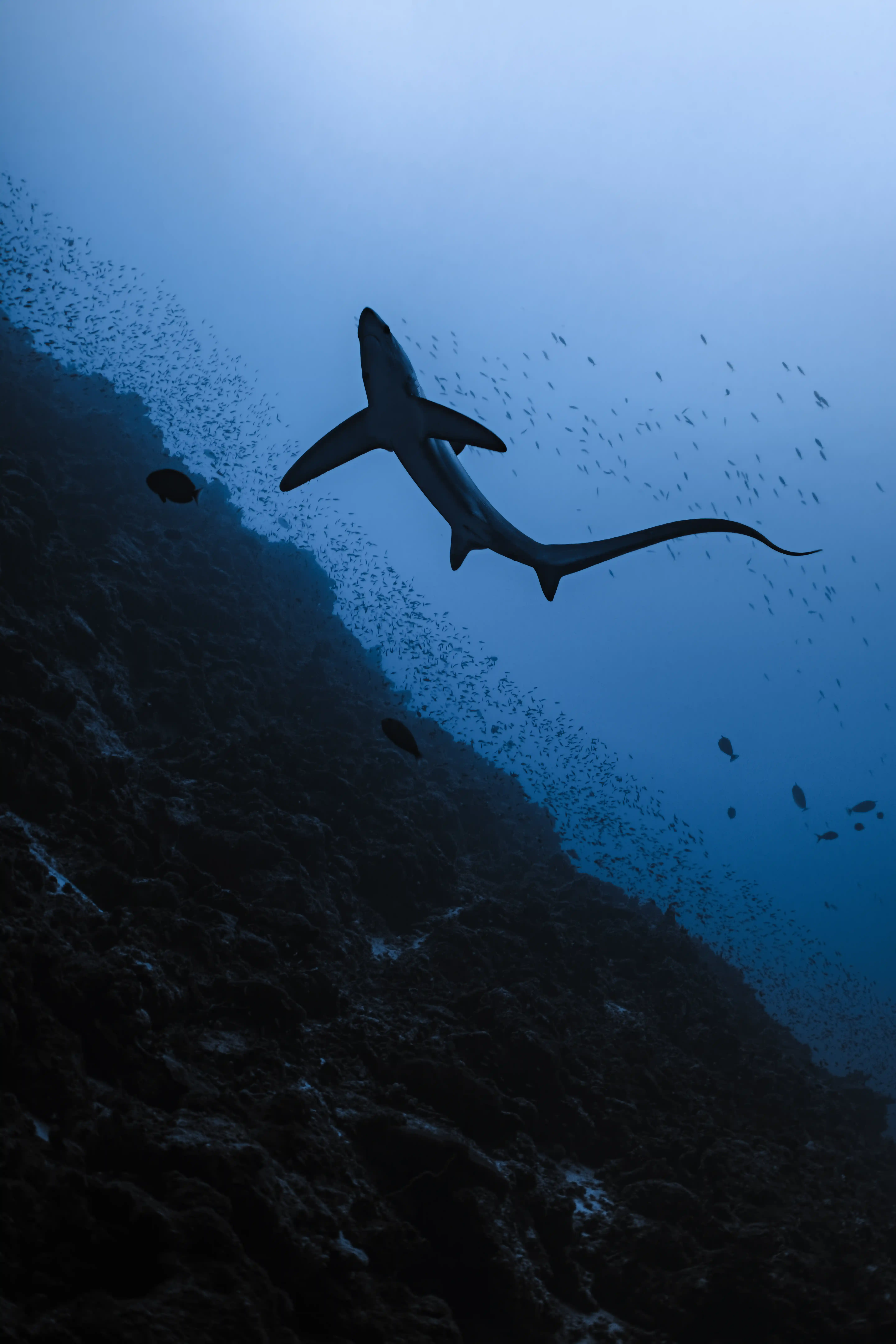 Every morning, just after sunrise, Thresher Sharks ascend from the abyss to visit the "cleaning stations" located on the reef ledges.