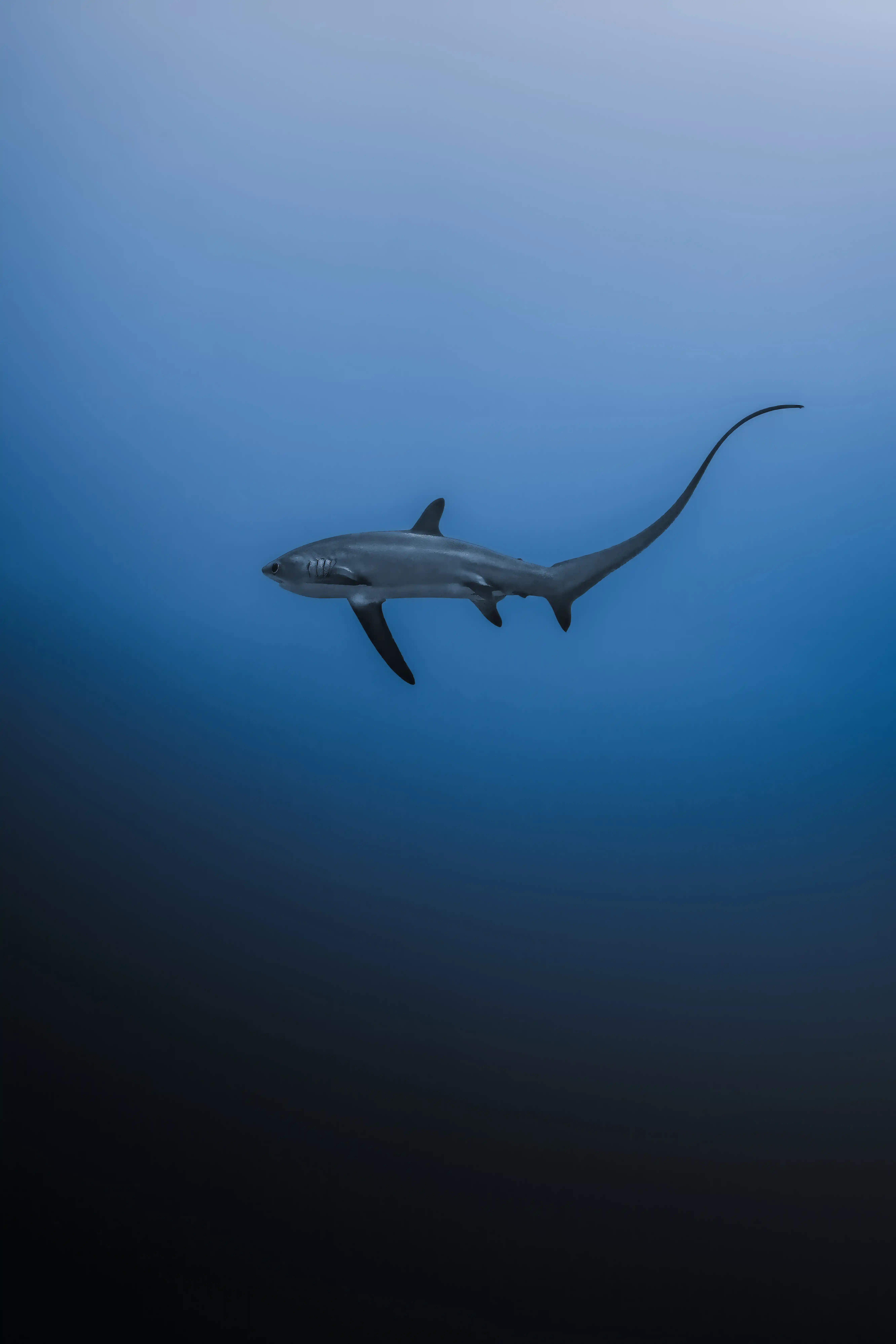 The Pelagic Thresher is easily identified by its metallic silver skin and the exceptionally long upper lobe of its tail fin. Unlike the Common Thresher, the Pelagic species has darker patches above the pectoral fins and no white patch over the gill slits.